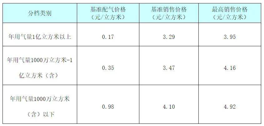 (三)调整销售价格。销售价格是指管道燃气经营企业通过城镇燃气管网将燃气销售给用户的价格,由气源价格和配气价格构成。结合分档差别配气价格,对我市市区非居民管道天然气销售价格进行调整。管道燃气企业与用户以基准价格为基础,可在上浮不超过20%、下浮不限的范围内协商确定具体销售价格。具体价格标准如下表: